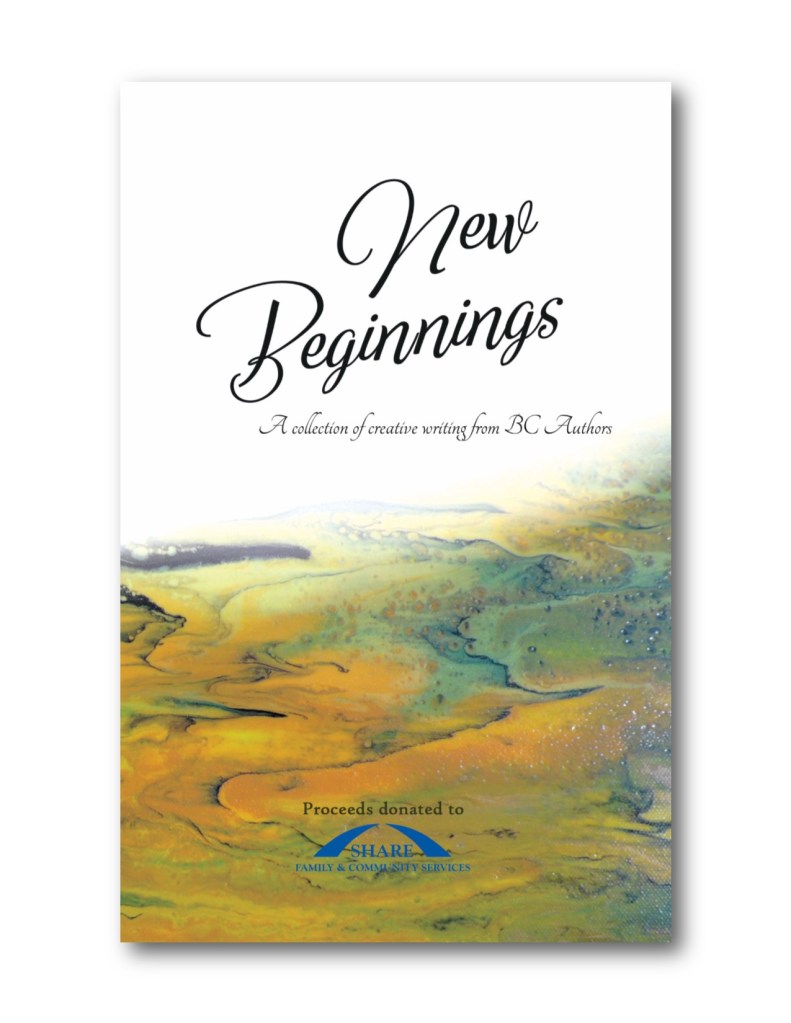 In 2019, I edited and published New Beginnings. It is a collection of creative writings from 39 local BC authors. All of the profits generated from the sale of this book are being donated to SHARE Family and Community Services. So far in 2020, we have donated $5000 to SHARE, and the TELUS Corporation has generously matched our donation.